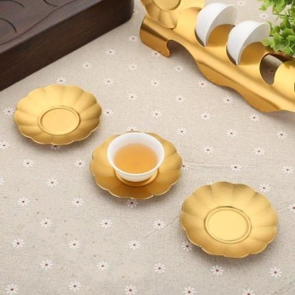 Overview Name: Tea Coaster Process: Titanium plating Material: Aluminum Color: titanium gold Style: flower type Specification: diameter 8.5cm Packing list: